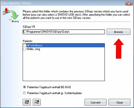 With SiDiary 6 (from version 6.0.1184) you can now choose the program folder of version 5 (where SiDiary.exe is located) or the data folder of version 5 (where the file SiDiaryProfile.dat is located) as the target file by using the button 'Browse'.