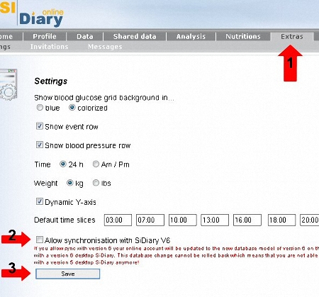 6a. BEFORE the first synchronization make sure that in SiDiary-Online in the menu 'Extras' the option 'Allow Synchronisation with SiDiary V6' is enabled and saved. (This step is not necessary if you have registered with SiDiary-Online for the first time after July 1st, 2009!)