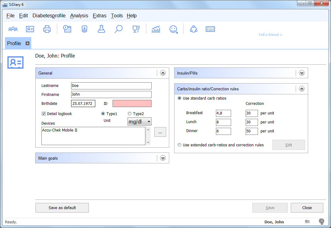 Additionally, you have to specify your correction rule for the main meals: The correction rule is for situations where your blood glucose level is too high. If that is the case, then you will have to inject a little more insulin not only for the intake of carbohydrates but to get your BG level down to target as well. If you've entered a value of 30, for example, the program will add a correction dose of one insulin unit for each 30 mg/dL too high.
