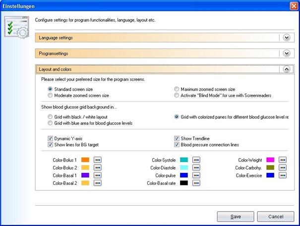 Show blood glucose grid background in: The overview in the detail-logbook can be displayed in different colors. Besides a design in black/white or blue you can display the different target ranges (under the target range, in the target range, a bit over the target range and high values) each in different colors. Your own adjusted target range will always be displayed in the color green.