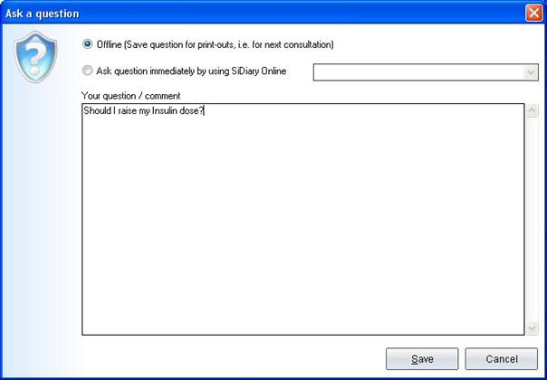 The following screen shows you that you can save a question or a comment for any day. These entries (in the Offline option) will be marked when you print them, so you can discuss them with your doctor.