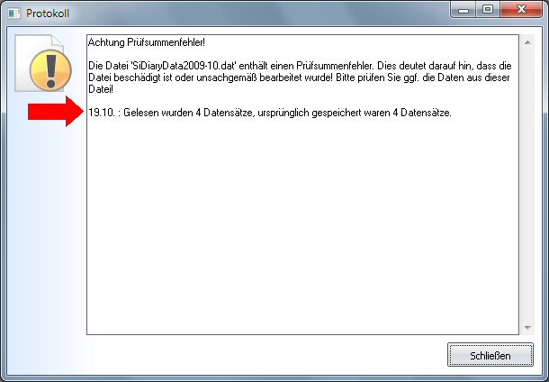 Damit sichergestellt ist, daß sich außerhalb von SiDiary an Ihren Daten nichts geändert hat, generiert das Programm beim Speichern eine Prüfsumme. Wurde diese Datei verändert oder beschädigt (z.B. durch einen Stromausfall, Festplattenschaden, Ausschalten des Rechners während des Speicherns usw.), so stimmt die Prüfsumme nicht mehr überein und SiDiary meldet Ihnen das (zusammen mit den Tagen, an denen etwas verändert sein könnte) um Sie so vor falschen Daten zu bewahren (siehe Bild)